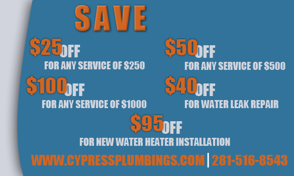 $100 off for any plumbing service of $1000- Phone: 281-516-8543Map Address: 13550 Woods Spillane Boulevard
