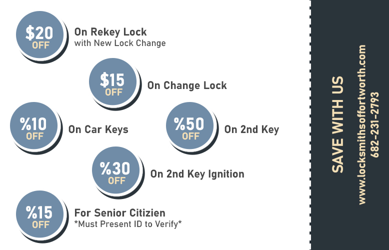 $20 off on rekey lock, $15 off on change lock, %10 off on car keys, % 50 off on 2nd key, %30 off on 2nd key ignition, %15 off for senior citizenOur services: