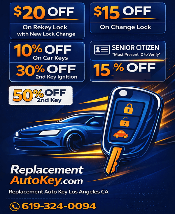 When vehicle key problems interrupt your day, with Replacement Auto Key Los Angeles CA you have a dependable automotive locksmith makes all the difference. We specialize in modern offerings for today’s vehicle security systems. From lost keys to ignition concerns, services are created to restore functionality without delay. Every solution focuses on accuracy, protection and extended reliability for drivers across Los Angeles. Call REPLACEMENT AUTO KEY LOS ANGELES CA on: (619) 324-0094